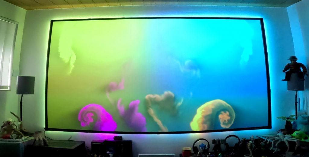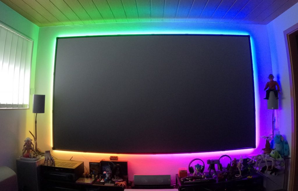 Da wir schon vor längerer Zeit auf einen Laser-TV mit einer 120 Zoll CLR-Leinwand umgestiegen sind, blieb mir also nur die Selbstbaulösung, um hier ein Ambilight zu ergänzen.