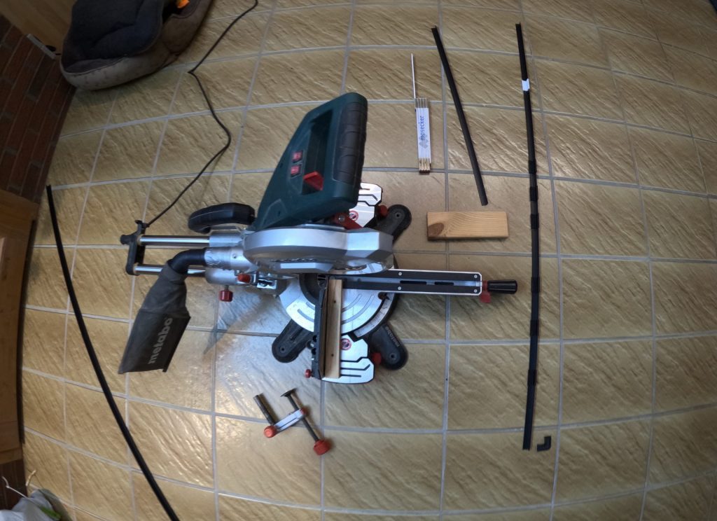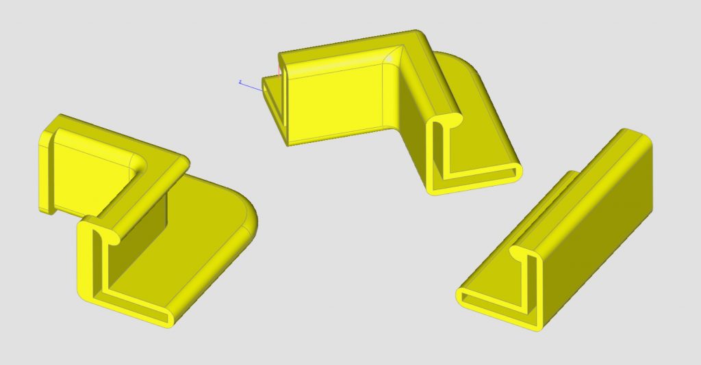Um es mir also einfacher zu machen und die Kosten im Rahmen zu halten, habe ich ganz einfach 15 Millimeter Winkelleisten aus schwarzem Plastik, im Baumarkt gekauft. Diese gab es aber nur in maximal 2,5 Meter Länge, also gut einen Meter zu kurz für mein Projekt. Zusätzlich zum Verlängern hatte ich auch noch das Problem der hässlichen Ecken und wollte die Leisten nicht mit einem 45Grad Winkel und einer sichtbar lichtdurchlässigen Schnittkante verbinden. Daher habe ich kurzerhand ein paar 3D Teile konstruiert und gedruckt. Mit meinen 3D Teilen kann ich jetzt ganz einfach die Leisten beliebig verlängern und unterfüttern, alles gerade abschneiden und dann einfach wie benötigt zusammenstecken, beziehungsweise kleben.