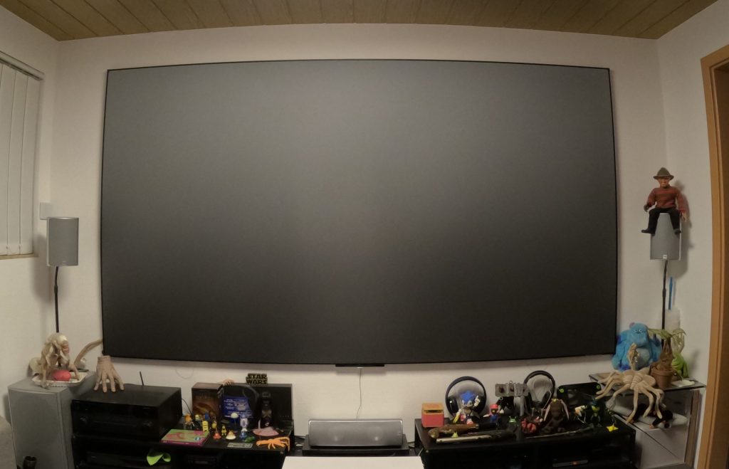 Trotzdem hat es sich gelohnt! Wenn man das Endergebnis betrachtet und die Baukosten zusammennimmt, möchte ich es jetzt schon nicht mehr missen. Der Leinwand hat das Ganze nicht geschadet und es sieht jetzt sogar so aus, als wenn es schon immer so gewesen wäre. Selbst im ausgeschalteten Zustand fällt die 15 Millimeter Ergänzung kaum auf.