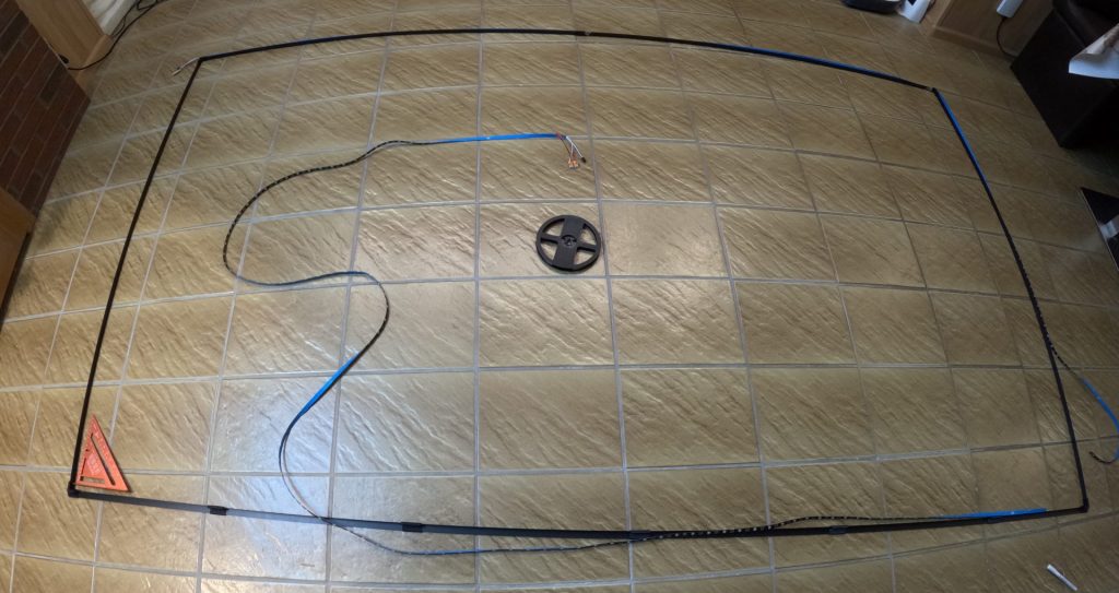 Ich verstehe gar nicht, warum das herstellerseitig nicht als Option mit angeboten wird, wo sich der Rahmen der Leinwand doch perfekt dafür anbietet die LED’s gleich beim Aufbau mit zu integrieren. Der extra Rahmen für die LED’s musste in meinem Fall natürlich genauso mattschwarz gehalten sein, wie der Rahmen der Leinwand selber, schon um sich nicht optisch davon abzuheben und den Effekt dadurch zunichte zu machen.