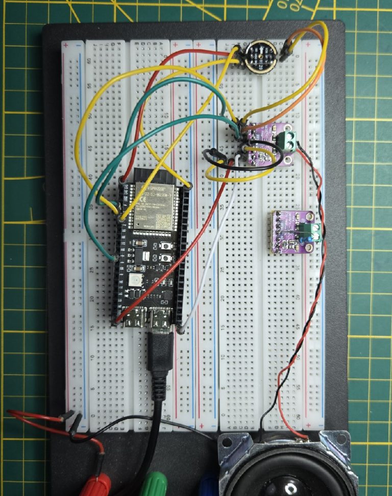 Ich verwende die üblichen Verdächtigen einen Max98357A als Verstärker und ein INMP441 als Mikrofon. Die LED ist eine Adressierbare WS2812 mit 5 Volt und als Lautsprecher verwende ich einen Aiyima 2,5“, 4 Ohm, 3 Watt, welche ich normalerweise gerne empfehlen würde, aber da meine letzten Lieferungen nur Schrott waren, rate ich eher zu einer Alternative von einem anderen Hersteller.