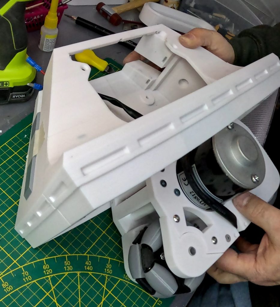 Weil ich aber noch mit der RC-Steuerung kämpfe und einige Klappen noch kein funktionsfähiges Scharnier haben, habe ich R2 auch noch immer nicht lackiert, so dass er derzeit noch sein Dasein als beleuchtetes Standmodell fristet obwohl er mit den beiden 150Watt Antriebsmotoren wahrscheinlich locker 30 Km/h schaffen würde 😊