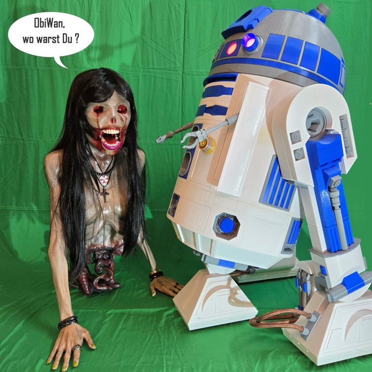Der gruselige 50 %-Zombie (Leia Organa) sollte meine Haustürdekoration aufwerten,… Leider stellte sich am Ende heraus, dass sie viel zu realistisch geworden war um in der Öffentlichkeit gezeigt zu werden. An Halloween sind hier einfach zu viele kleine Kinder unterwegs um unsere Leia nach draußen zu stellen und selbst im Haus wollte irgendwie auch niemand mit ihr allein im Dunkeln bleiben…